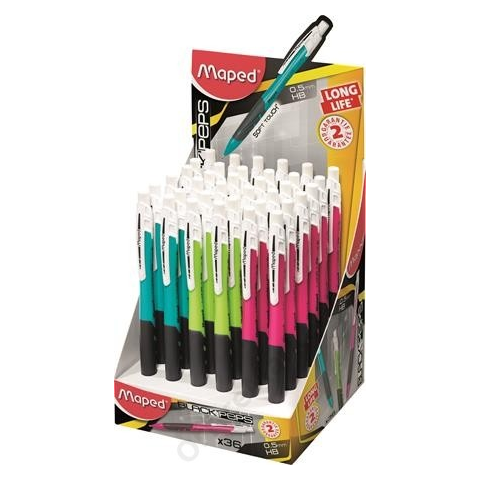 Nyomósirón display, 0,5 mm, MAPED Long Life, vegyes színek (IMA564040) műanyag tolltest és kiegészítők gumírozott fogórész 50 %-kal több grafitbél fér bele más nyomósironokhoz képest vonalvastagság: 0,5 mm Gyártó/első EU forgalmazó elérhetősége: MAPE