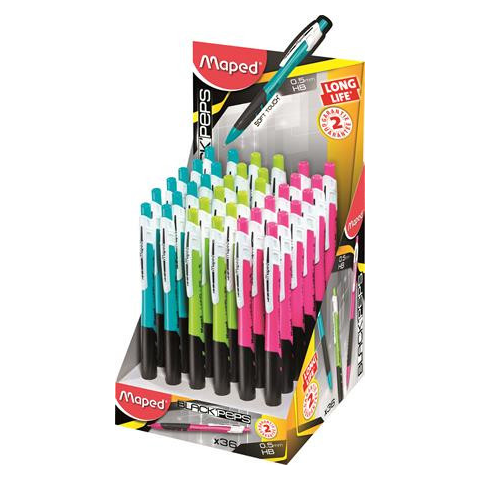 Nyomósirón display, 0,5 mm, MAPED Long Life, vegyes színek műanyag tolltest és kiegészítők gumírozott fogórész 50 %-kal több grafitbél fér bele más nyomósironokhoz képest vonalvastagság: 0,5 mm Gyártó/első EU forgalmazó elérhetősége: MAPED SAS 530 ro