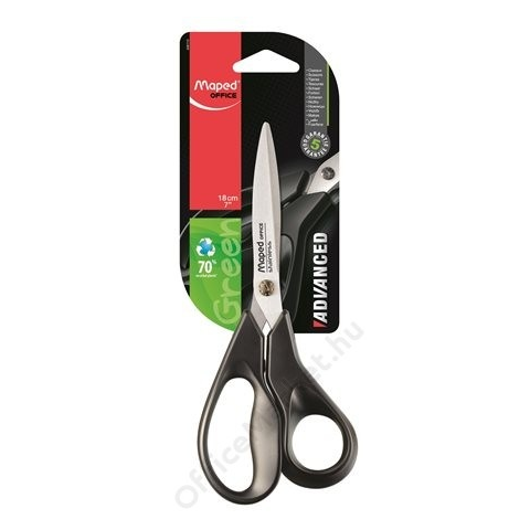 Olló, irodai, 18 cm, MAPED Advanced Green (IMA498110) ergonomikus kialakítás, illeszkedik a kéz vonalára rozsdamentes acélpengével és szegeccsel nyele 60%-ban újrahasznosított műanyagból készül környezetbarát csomagolás 10 év garancia Gyártó/első E