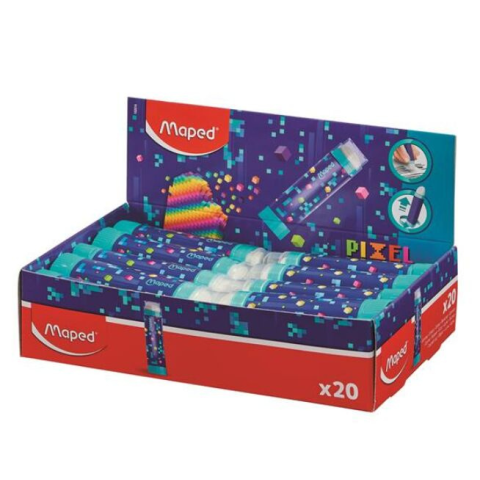 A Maped Pixel Party kollekciójával egy retro-futurisztikus környezetbe csöppenhetünk, mely fiúknak és lányoknak egyaránt vonzó világot jelent. -hatékony és praktikus radír, mely tiszta marad a tolltartóban is -csavaró mechanizmusával könnyen használható - akár egy ragasztóstift -trendi mintája magával ragadó -PVC- és ftalátmentes   Gyártó/első EU forgalmazó elérhetősége: MAPED SAS 530 route de Pringy - 74370 Argonay sophie.souillard@maped.fr www.maped.c