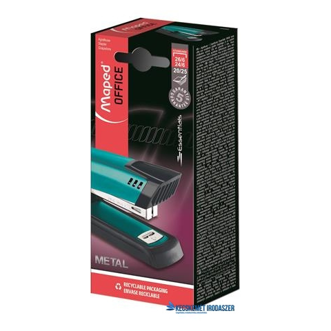 Essential - Egyszerűen szükséges!   Erőteljes tűzőgép a teljesítmény jegyében.   - fém test - tűzési mélység: 61 mm - tűzőkapocsméret: 24/6, 26/6 - tűzési kapacitás: 25 lap (26/6)/20 lap (24/6) - 180° fokban kihajtható, ezért könnyen nyitható és tölthető - tűző, szegező funkció - csomagolása újrahasznosított anyagból készül - 5 év garancia   Gyártó/első EU forgalmazó elérhetősége: MAPED SAS 530 route de Pringy - 743