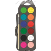 Termékjellemzők: - Kiváló minőségű vízfesték. - Különböző mennyiségű víz hozzáadásával többféle hatás érhető el. - A doboz 12 féle színt és egy ecsetet tartalmaz. - Korongok átmérője: 30 mm. - Praktikus méretű, könnyen tárolható.