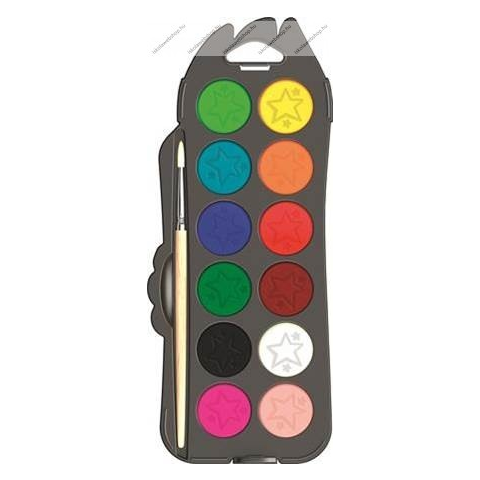 Termékjellemzők: - Kiváló minőségű vízfesték. - Különböző mennyiségű víz hozzáadásával többféle hatás érhető el. - A doboz 12 féle színt és egy ecsetet tartalmaz. - Korongok átmérője: 30 mm. - Praktikus méretű, könnyen tárolható.