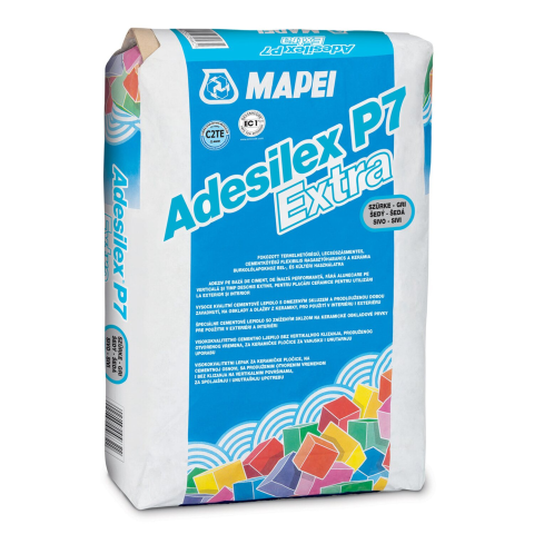 Az Adesilex P7 Extra C2TE osztály szerinti fokozott terhelhetőségű (2), lecsúszásmentes (T), nyújtott nyitott idejű, cementkötésű (C) ragasztóhabarcs. Alkalmazási terület: Minden típusú kerámia burkolólap és mozaik ragasztása beltérben falra és padlóra. Kerámia burkolólapok (egyszer-, kétszer égetett kerámiak, gres, porcelán, klinker stb.) és mozaikok ragasztása a kültéri padlókon és falakon. Alkalmas kültéri folyosókra, fedett teraszokra és erkélyekre. Je