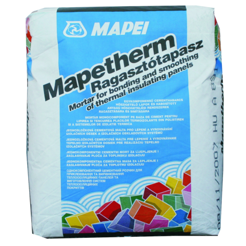 Mapetherm ragasztótapasz - 25 kg - egykomponensű, cementkötésű habarcs - hőszigetelő táblák és felületi hőszigetelő rendszerek ragasztására és simítására - közvetlenül a vakolt, betonrészekből vagy beton falazóblokkokból készült falak, mennyezetek kül- vagy beltéri felületeire történő ragasztáskor - anyagszükséglet: -- hőszigetelő táblák felragasztásához: 2-3,5 kg/m2 -- simításra: 4-6 kg/m2