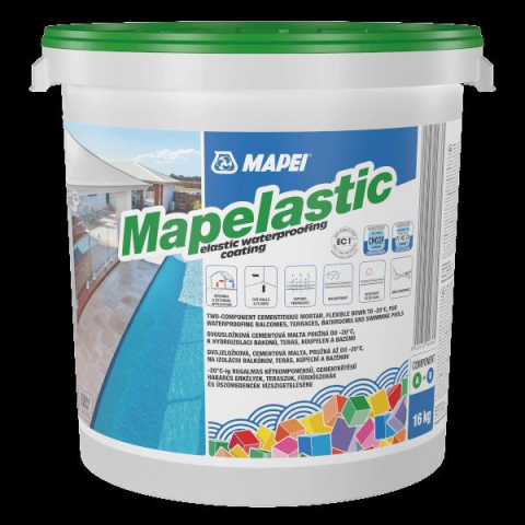 Mapelastic kenhető vízszigetelés 16 kg-os kiszerelésben. Kétkomponensű, cementkötésű habarcs erkélyek, teraszok, úszómedencék, fürdőszobák és betonok vízszigetelésére. Rugalmas marad -20°C-ig. Anyagszükséglet: 1,7 kg/m2 rétegvastagság mm-enként simítóval felhordva, 2,2 kg/m2 rétegvastagság mm-enként szórással felhordva.