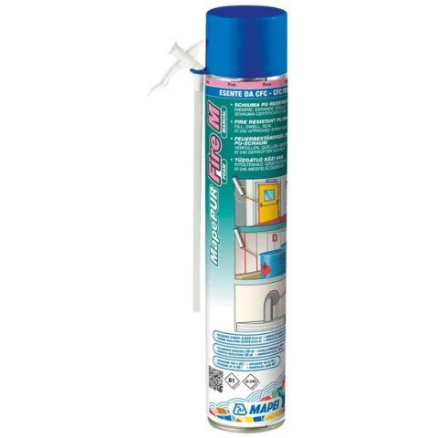 Mapei Mapepur Fire Foam M egykomponensű, tűzálló, vízálló, duzzadó poliuretán hab kitöltéshez, rögzítéshez, hangszigeteléshez és szigeteléshez, nyílászárókhoz és egyéb általános építési hézagok kitöltéséhez. Használatához nem szükséges purhab-kinyomó pis