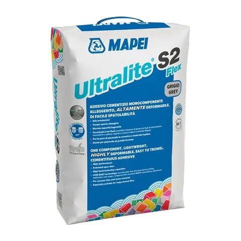 Mapei Ultralite C2E S2 flex csemperagsztó egykomponensű, fokozott terhelhetőségű, nagy alakváltozásra képes, könnyű súlyú ragasztó, amely ideális nagy formátumú greslapok, akár vékony burkolólapok ragasztására padlóra és falra, beleértve a kültéri homlok