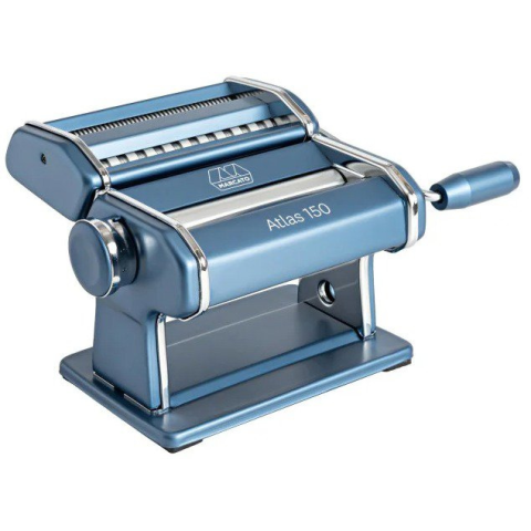 Tésztagép - kézi, lasagna és Fettuccine készítéséhez, 0,6 - 4,8 mm tésztavastagsághoz, max. tésztaszélesség 150 mm, tésztavastagság beállítása, cserélhető tartozékok, fém konstrukció, kék kivitel, mérete 15 × 20 × 20 cm (Ma×Sz×Mé), tömege 3,5 kg A Marcato Atlas 150 kézi tésztagép egyedi olasz stílusú designt kínál. A kék alumínium felület teljesen élelmiszer-biztonságos. Maga a gép krómozott acélból készül, így garantálva a megbízhatóságot é