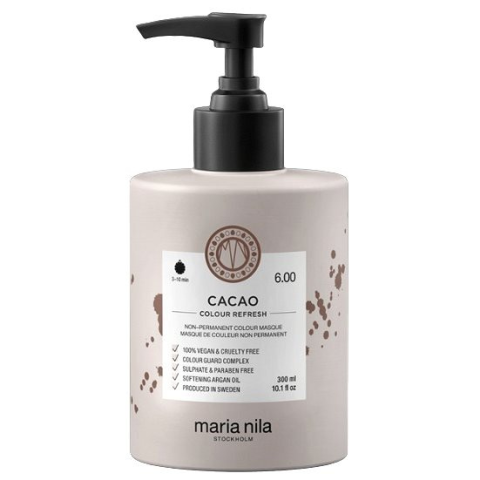 Természetes hajfesték - hajszínező, színélénkítő hatású, akár 4 mosásig tartó színhatás, krém állagú A MARIA NILA Colour Refresh 6.00 Cacao egy természetes, 2in1 ápoló maszk és hajfesték. A svéd márka kíméletes formulája nemcsak táplálja és regenerálja a hajat, hanem élénkíti is annak színét. A 6,00