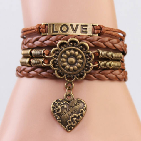 MariaKing Barna fonott műbőr LOVE infinity többrétegű karkötő szív charmmal
