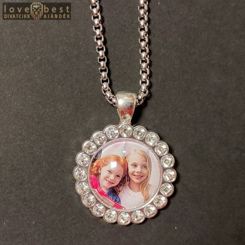 MariaKing Fényképes nyaklánc acél box chain lánccal, strasszal kirakott medállal (márkadobozzal)