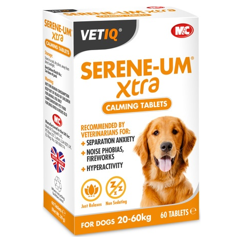 A Serene–UM Xtra tabletta természetes összetevőket tartalmazó kiegészítő takarmány kutyák számára viselkedési problémák, hiperaktivitás, nyugtalanság, szorongás, továbbá tűzijátéktól és mennydörgéstől való félelem, utazási problémák és túlzott ugatás esetén.