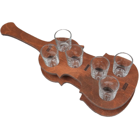 Hegedű alakú fa pohártartó szett. Cseresznye fa. 35x13x4 cm. A pohár űrmértéke: 0,03 l. Sötétbarna színben. A poharakat első használat előtt és minden használat után meleg mosószeres