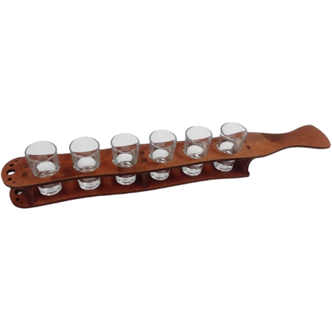Fa pohártartó szett 6 db pálinkás pohárral. Világos barna. 48x5x8cm. Pohár űrtartalma: 0,02 l.