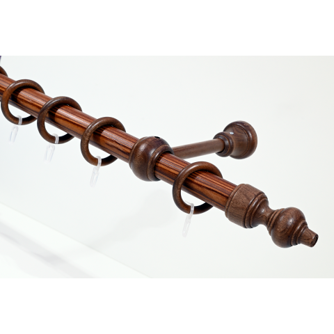 Filigrano Ø 28 mm 1 soros dió színű fakarnis - 100% fa, komplett rúdkarnis, tartókonzolokkal, függönykarikákkal, végzárókkal és a felszereléshez szükséges csavarokkal és műanyag tiplikkel. Rendelhető méretek: 160cm, 200cm, 260cm, 300cm.