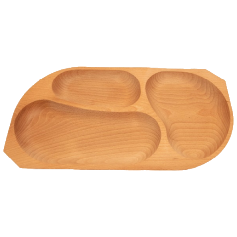 Fa tálaló 3 adagos. 23x43 cm. Belső méretek: 24×9 cm, 15×6 cm, 17×12 cm (a három rész) Natúr színű. Mosogató gépben nem mosható. Nem áztatható vízben. Tisztítása: