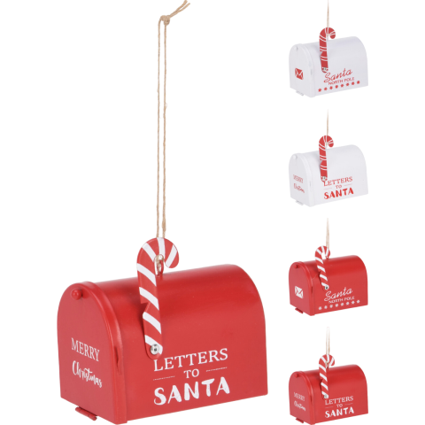 Függő postaláda dekor, 4 féle: fehér santa/ fehér letters/ piros santa/ piros letters/, anyaga: fém, mérete: 7x8x6 cm