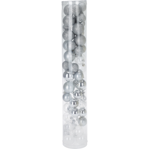 anyaga: műanyag , a gömbök átmérője:: 4CM és 5CM, színe: ezüst, 60 db/ szett, tartlama 5CM: 3X MATT, 3X fényes, 6X glitteres, 6X áttetsző, 4CM: 5X MATT, 9X fényes , 12X glitteres, 16X áttetsző