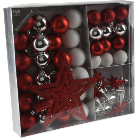 anyaga: polipropilén, 45 db/szett, tartalma: piros/fehér/ezüst, szett tartalma: 24X50MM gömb: 6X fényes, 6X matt, 12X glitter, 12X40MM gömb: 3X fényes, 3X matt, 6X glitter, gyöngy girland 8MMX4M, 1X csúcsdísz 200MM, 7X80MM csillag dekor: 3X fényes, 2X matt, 2X glitter