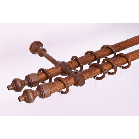 Filigrano Ø 28 mm 2 soros dió színű fakarnis - 100% fa, komplett rúdkarnis, tartókonzolokkal, függönykarikákkal, végzárókkal és a felszereléshez szükséges csavarokkal és műanyag tiplikkel. Rendelhető méretek: 160cm, 200cm, 260cm, 300cm.
