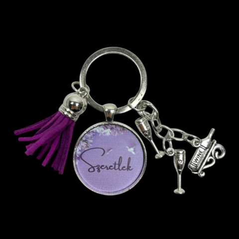 Kulcstartó charm 4 fajta levendula mintával, magyar nyelvű felirattal lila, fehér, fém színben. 3,2x6,5 cm. 9 fajta mintával.
