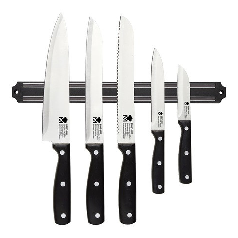Leírás Anyaga: rozsdamentes acél Korrózió álló Csúszásmentes nyél Matt kivitel Szett része: szakács kés, kenyérvágó kés, szeletelő kés, univerzális kés, hámozó kés, mágneses késtartó