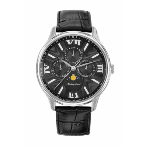 A MATHEY-TISSOT Edmond Moon szépen dekorált számlapján a hónap, nap és a hét napja információkon kívül a félhold alakú ún. öblös holdfázis kijelzőn bármikor nyomon követheted a Hold mozgását, ahogy kering a Föld körül. Egész
