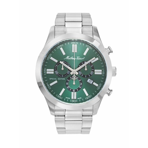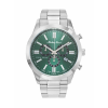 Sportos kronográf 44mm-es nemesacél tokban, karcálló zafír üveggel, smaragd zöld számlappal. SWISS MADE
