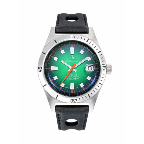 Vintage búváróra fazon a 70-es évek jellegzetes hangulatával és színátmenetes zöld számlappal. A korabeli Mathey-Tissot Mergulhador UHF modellnek a pontos mása, viszont a kor igényeinek megfelelően 41-es óratokban, karcálló zafír ü
