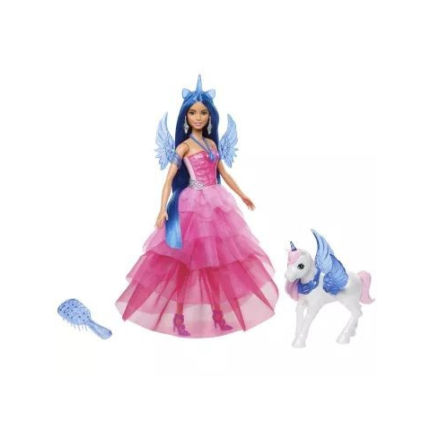 Barbie: 65. évfordulós Zafír hercegnő baba gyerekeknek. A baba rózsaszín fodros ruhát visel, haja kék. Tiarát visel, karjára kis szárnyak tehetők, farkincája levehető. A szett egy alikornis barátot is tartalmaz. A színek és díszítések eltérhetnek a képen láthatótól.