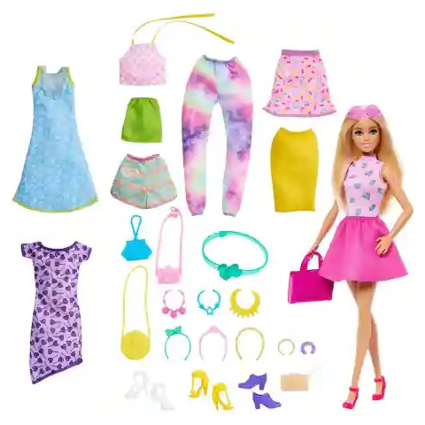 Frissítsd fel Barbie babád ruhatárát! Ez a Barbie baba ruhákkal készlet több mint 25 ruhadarabot és kiegészítőt tartalmaz, amelyek lehetővé teszik a gyerekek számára, hogy szabadon kombinálják Barbie megjelenését. Fényképezőgéppel, négy különféle táskával