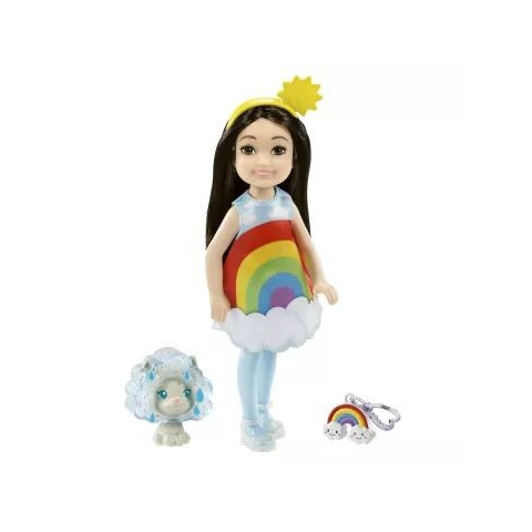 Mattel Barbie Chelsea Club: Barna hajú baba szivárvány jelmezben cica figurával