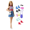 Barbie baba divatos ruhát visel 11 kiegészítővel, amelyeket összekeverhetsz, majd egymáshoz illeszthetsz! Öt pár cipője van, három pénztárcája, egy napszemüvege és egy nyaklánca, ami kiegészíti a megjelenését. Van még egy kényelmes dolog is – egy vizesüv