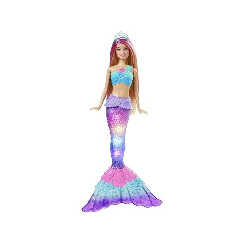 A Barbie Dreamtopia - Tündöklő szivárványsellő Barbie baba tökéletes ajándék a 3-7 éves kislányoknak, akik szeretik a mesék, tündérek, hercegnők és sellők világába elképzelni magukat. A sellő Barbie hosszú, szőke hajában rózsaszín csíkok vannak és tiarát visel. Merítsd a gyönyörű Barbie babát a vízbe és láthatod, ahogy csillámos és gyöngyházas uszonya a négy szín show egyikében ragyog.
