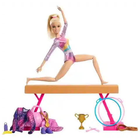 A Barbie tornász baba kiegészítőkkel játékszett segítségével, a gyerekek elképzelhetik milyen érzés lehet egy versenyen szerepelni. A baba csillogó, színes tornadresszt, szőke, csinos kontyba fogott frizurát és visszafogott sminket visel, a bemelegítéshez