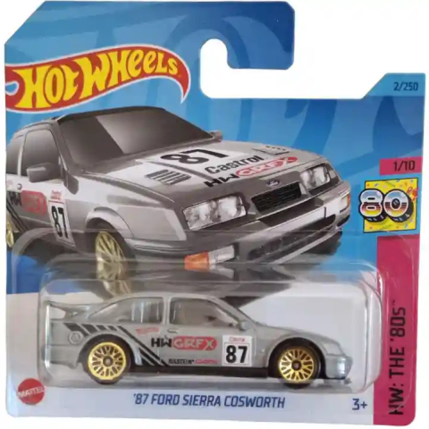 A Mattel Hot Wheels '87 Ford Sierra Cosworth 1:64 méretarányú kisautóval izgalmas versenyeket rendezhetsz. A szépen kidolgozott részletek még valósághűbb játékot kínálnak a gyerekeknek és még nagyobb értéket a gyűjtőknek.