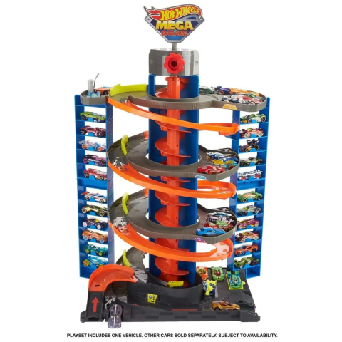 A Hot Wheels mega garázs készlet 4 szinten, közel 60 darab autó parkolására képes. A garázs közepén egy kézzel működtethető spirál lift forog, amivel bármelyik szintre egyszerűen eljuttathatók az autók. A garázs a csatlakozó pontjaival további (külön megv