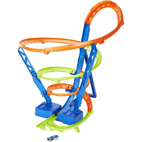 A készlet egy véletlenszerű (nem feltétlen a képeken szereplő!) Hot Wheels járművet tartalmaz, a további járművek külön megvásárolhatók! A Hot Wheels szédületes ciklon autópálya három ütközési zónájával és az autókat mozgásban tartó motoros gyorsítóval