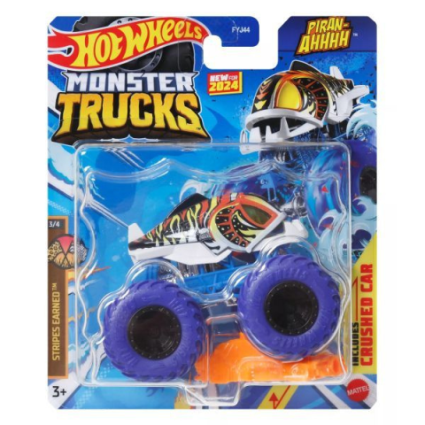 A Hot Wheels Monster Trucks 1:64 méretarányú kisautóinak nincs párja, ha versenyről, trükkökről vagy zúzásról van szó!Óriási kerekeik nagy előnyt adnak nekik az autó-autó elleni küzdelmekben. Minden járgány dobozában megtalálható egy gyűjthető kerék is, amely segítségével a gyerekek megismerhetik az autók részletes adatait is, beleértve a járgányok nevét, típusát, erősségeit, sajátos trükkjeit és specialitásait. Sőt... egy összenyomott, műanyag kisa