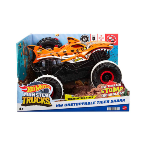 Szakíts és mássz át mindenféle terepen a Hot Wheels Monster Trucks terepmászó Tiger Shark távirányítós járgánnyal, ami a jól ismert szörnyteherautó 1:15-ös méretarányú, részletgazdagon kidolgozott másolata! Ez a távirányítós Monster Truck szörnyeteg a Hot Weels Terrain Stomp technológiájával átgázol a füvön, szikláko