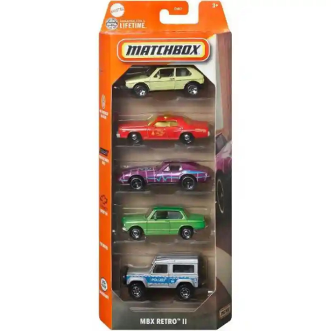 Matchbox 5 MBX Retro™ II kisautók: az 5db, 1:64 méretarányú kisautót tartalmazó kollekciójával bármikor megtalálhatod a pályára legalkalmasabb járművet. A szépen kidolgozott részletek még valósághűbb játékot kínálnak a gyerekeknek és még nagyobb értéket a