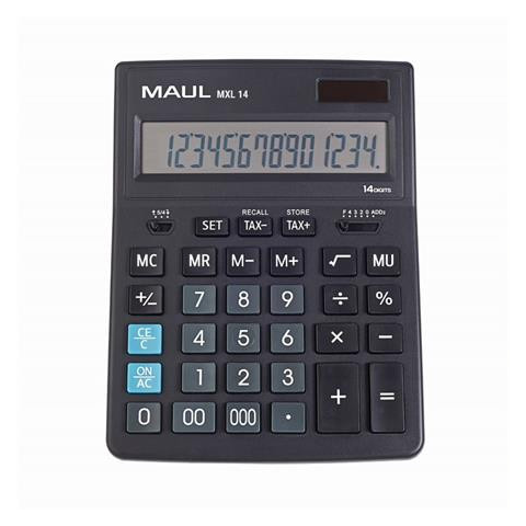 Számológép, asztali, 14 számjegy, MAUL MXL 14 Kereskedelmi asztali számológép, erős, stabil és robusztus, extra nagy házzal. -14 számjegyes, nagy döntött 1 soros LCD kijelző (126,5x26,5 mm) -funkcióbillentyűk és számbillentyűk különböző színűek, a gyo