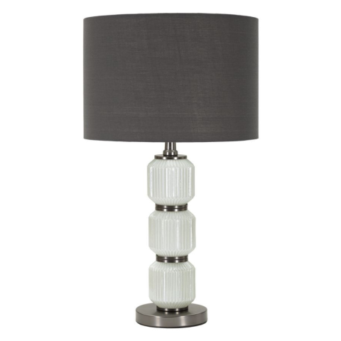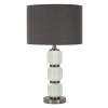 Elegáns asztali lámpa fehér üvegtalppal és szürke bársony ernyővel modernitást áraszt, tökéletes otthona minden szegletének stílusos megvilágításához. Elegáns asztali lámpa fehér üvegtalppal és szürke bársony ernyővel modernitást áraszt, tökéletes otth