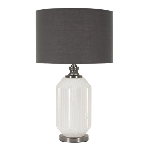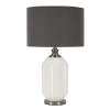 Elegáns asztali lámpa fehér üvegtalppal és szürke bársony ernyővel modernitást áraszt, tökéletes otthona minden szegletének stílusos megvilágításához. Elegáns asztali lámpa fehér üvegtalppal és szürke bársony ernyővel modernitást áraszt, tökéletes otth