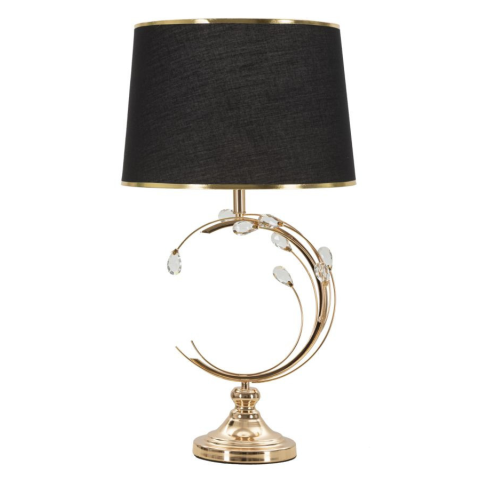 Arany fém asztali lámpa geometrikus díszítéssel, virágokra emlékeztető elegáns alkalmazásokkal. Fekete szövet lámpaernyővel, arany díszítéssel. Arany fém asztali lámpa geometrikus díszítéssel, virágokra emlékeztető elegáns alkalmazásokkal. Fekete szöve