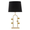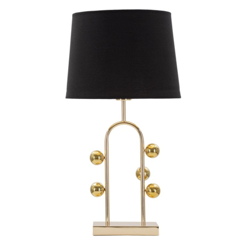 Arany fém asztali lámpa különleges lineáris kialakítással, dekoratív gömbökkel és fekete szövet lámpaernyővel. Arany fém asztali lámpa különleges lineáris kialakítással, dekoratív gömbökkel és fekete szövet lámpaernyővel.