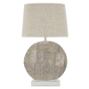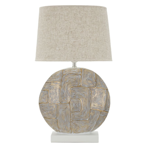Gyanta asztali lámpa elegáns geometriai díszítéssel, domborműben. Bézs szövet lámpaernyővel kiegészítve. Gyanta asztali lámpa elegáns geometriai díszítéssel, domborműben. Bézs szövet lámpaernyővel kiegészítve.