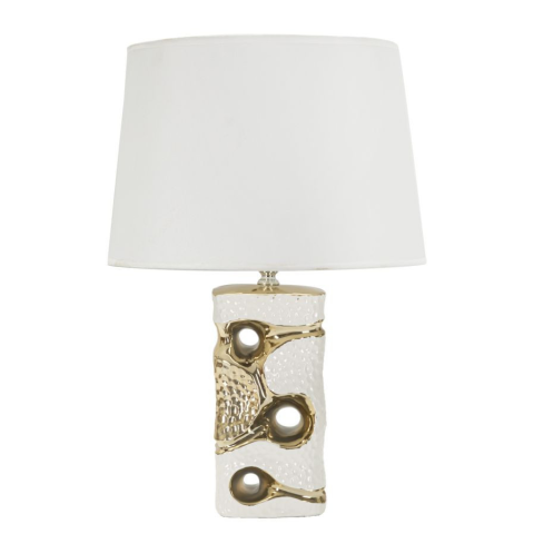 Fehér és arany színű kerámia asztali lámpa puha és kanyargós kialakítással, elegáns lyukakkal. Komplett fehér szövet lámpabúrával. Fehér és arany színű kerámia asztali lámpa puha és kanyargós kialakítással, elegáns lyukakkal. Komplett fehér szövet lámp