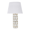 Asztali lámpa fehér és arany kerámiából, domborműben elegáns geometrikus díszítéssel. Komplett fehér szövet lámpabúrával. Asztali lámpa fehér és arany kerámiából, domborműben elegáns geometrikus díszítéssel. Komplett fehér szövet lámpabúrával.